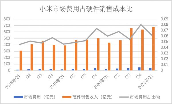 但在2021年Q1,市场费用占硬件销售比回到上年同期的水平,换言之,在硬件销售成长中并未加重市场费用的负担。