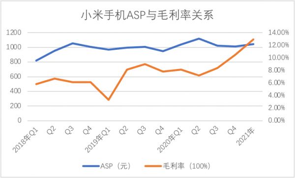 在上图中,虽然小米手机业务ASP与毛利率偶呈正相关性,但拉长时间周期,两组曲线的规律性就相当之弱了,综合前文所述PPI对毛利率干扰性,我们不难发现,在2020年Q3之前,决定毛利率的并非ASP,而是PPI。