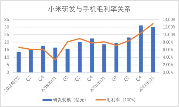 在上图中,可以比较直观看到小米研发规模乃是不断增长的,2020年达到了93亿元的规模大,2021年Q1仍然保持了61%的同比增长,在2020年Q3后,毛利率进入快速改善区间,彼时研发季度支出跨过了20亿元大关。