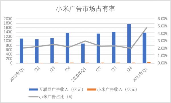 但2021年Q1小米广告市场占比有了相当大的改善,市场占比环比增加两倍,这是本季度财报相当大的亮点,这究竟是趋势性的还是暂时性的呢?