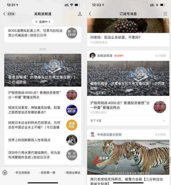 5. 第四次就在昨晚,这次也是微信目前最大规模、最不惜力的一次双向打通,订阅号信息流、常读订阅号都是公众号最显著的入口,视频号直播的提示方式也极为突出,而从视频号直播的评论区,又可以再向公众号导流。