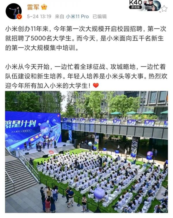 雷军在培训会上表示:这是小米创办 11 年以来,第一次大规模的校招。