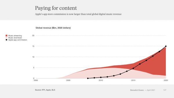 但是,与此同时却发生了其他的事情。史蒂夫·乔布斯在2008年创立应用商店时,他说对商店的交易抽佣只是用来弥补运营成本,但是在12年后的2020年,苹果应用商店抽取的佣金收入已经接近150亿美元,这已经超过数字音乐业的全球总收入,而且利润率也要高得多。