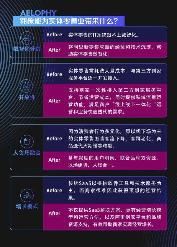 而“翱象”,是过去4年,沉淀了过去几年阿里巴巴建立盒马、对大润发等商超旧城改造积累的新零售经验和技术能力,有足够对商超赋能的跑通经验。