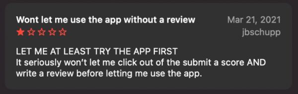 “至少让我先试试这个应用吧!它非要让我在使用这款应用前就提交分数和写评论。”
