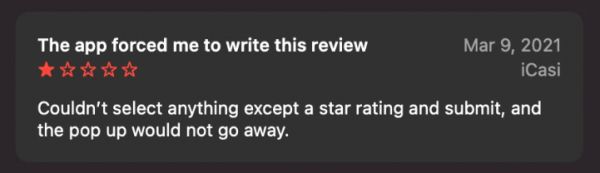 https://forums.macrumors.com/threads/app-store-scam-app-required-a-good-review-to-function-at-all.2297909/