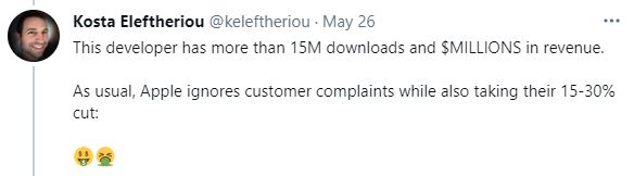 就连 Kosta Eleftheriou自己,都在推特谴责了苹果不顾用户投诉的行为: