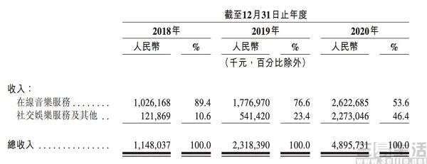 据网易云音乐公布的招股书显示,2018年至2020年间,其营业收入分别为11.48亿、23.18亿、48.96亿元,归属于公司股东的净亏损分别为20.06亿、20.16亿、29.51亿元。而在具体的收入结构上,其收入为在线音乐服务、社交娱乐服务及其他,其中2020年来自在线音乐服务的营收为26.23亿元,占比达53.6%,来自社交娱乐服务及其他的收入则为22.73亿元,占比46.4%。