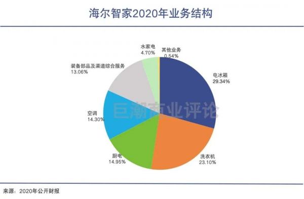 海尔智家的业务结构中,有超过一半营收来自于冰箱、洗衣机这两大传统白电,而空调业务仅占到了14.3%。反观格力有70%以上的收入来自空调;美的75%以上的收入来自空调和小家电。