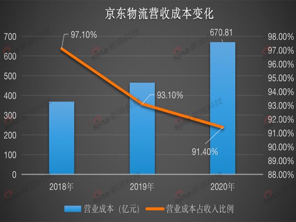 体现在营业成本上,占收入比例也一直很高,2018年至2020年,京东物流营业成本分别为367.93亿元、464.15亿元、670.81亿元,占比分别为97.1%、93.1%和91.4%。