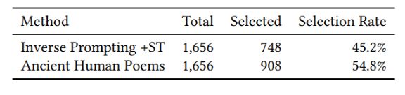 测试总共生成了 1500 首诗歌,并为每次测试随机显示在内的 5 对诗歌(真实古诗 + 生成古诗)。370 个玩家产生的 1,656 个游戏记录显示,45.2% 的用户难以辨别模型生成的诗歌。这一结果表明,结合了 Inverse Prompting 和 self-training 方法的诗歌生成质量,对于普通的在线用户来说可能接近人类水平。