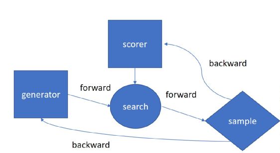 如上图所示,其中,生成器会负责生成大量的诗句 candidate,用 scorer 去判断这些诗句的好坏、search 出比较好的诗歌之后,能够得到的较优质的诗歌 sample,它们会比经过比生成器直接生成的要好,再用这些优质的诗歌 sample 去重新 finetune 生成器。