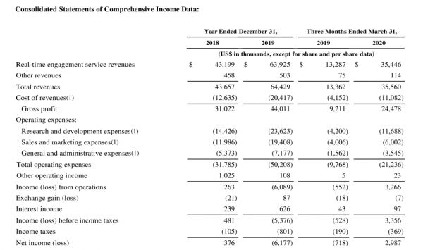 声网在去年一季度还实现了扭亏为盈,净利润为298万美元。而在此之前,声网的盈利状况一直堪忧。招股书显示,其2018年有38万美元的净利润,2019年由盈转亏,亏损了618万美元。