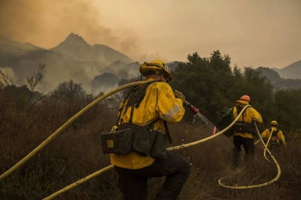 2018年,洛杉矶县消防员在圣莫尼卡山国家休闲区(Santa Monica Mountains National Recreation Area)扑灭伍尔西大火。©️大卫·麦克纽(David Mcnew)