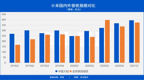 要知道,海外市场、尤其是海外手机市场的强劲增长,对小米而言意义重大。财报显示,一季度,小米境外市场收入为374亿元,同比增长50.6%,占集团总收入48.7%。