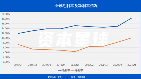 最终我们看到,小米集团一季度毛利率由去年同期的15.2%提高到18.4%;净利率则达到10.1%,较去年同期上升5.75个百分点。