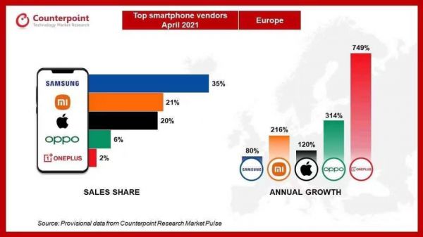 据Counterpoint公布的数据显示,今年4月,OPPO、一加手机在欧洲的市场份额为6%和2%。虽不及排在前面的三星、小米等,但年增速高达314%和749%,成为国内手机在欧洲市场增长最快的品牌。
