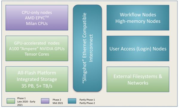 Perlmutter 基于包含 Slingshot 互连的 HPE Cray Shasta 平台,这是一个具有 GPU 加速节点和 CPU-only 节点的异构系统。该系统分两个阶段进行安装,第一阶段包括系统的 GPU 加速节点和暂存文件系统(scratch file system)。第二阶段将在今年年晚些时候添加 CPU-only 节点。