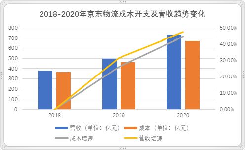 从招股书披露的收入来看,京东物流2018年、2019年、2020年全年收入分别为379亿元、498亿元、734亿元。2019年、2020年同比增长31.4%和47.4%。京东物流的收入呈现了逐步增长的态势。