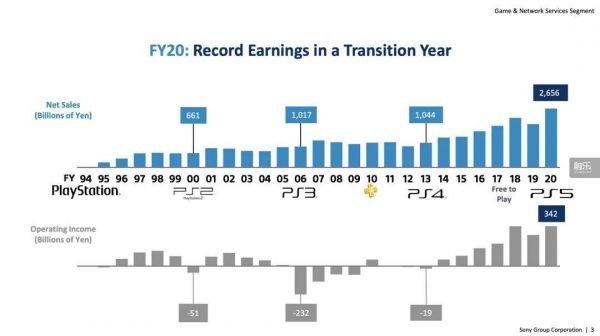 从数据里不难看出,目前PS5处在一个有些尴尬的境地。一方面,它在历代PlayStation主机里首年销量最高,售出超过780万台——此处的首年是指PS5开卖时所处的财年,即从2020年4月1日至2021年3月31日的时间段内——相比之下,PS4的首年销量是760万台。因为PS5的上市,2020财年,索尼游戏业务的净销售额达到26560亿日元(约合243亿美元、1551亿人民币)——相比之下,2019财年销售额是19776亿日元,同比增长了34%。