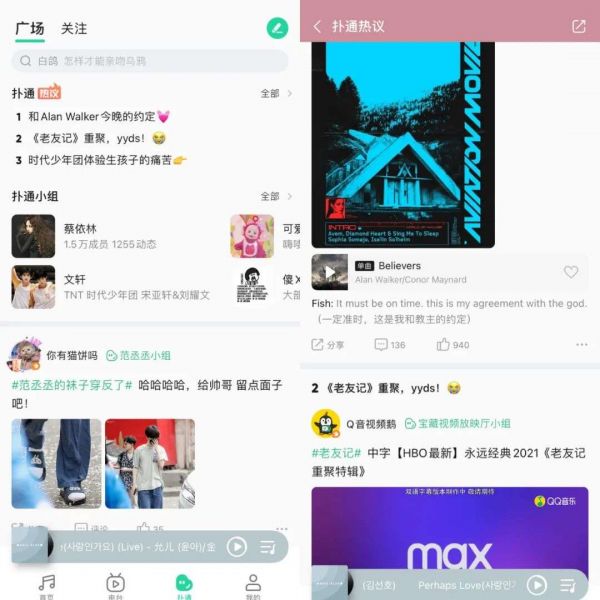 QQ音乐扑通社区和热榜页面截图