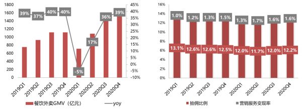 美团餐饮外卖业务佣金率和广告变现率表现 来源:中信证券