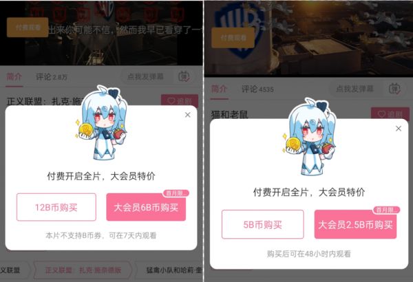 今年,多部院线电影同步上线了爱优腾和B站,平台均采取了单片付费模式。比如,《猫和老鼠》,大会员2.5元观影,非大会员则需要支付5元。