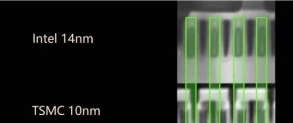 上图就是英特尔14nm和台积电10nm的晶体管栅格宽度对比,事实上并没有差太多。