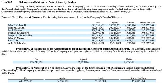 不久前,AMD举行了公司董事会成员的重新选举,任期最长的 John Caldwell 主席也参加了选举会。投票结束后,AMD与美国证券交易委员会(SEC)分享了投票结果:AMD总裁苏姿丰以压倒性支持使其他公司董事会成员黯然失色——7.3亿票。