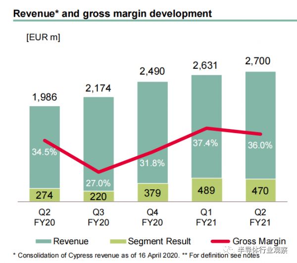 根据英飞凌发布的截止至2021年3月31日的2021年财年第二季度财报显示,在该季度中公司营收达到了27亿欧元,毛利率为36.0%。