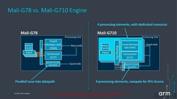 首先,ARM确实修改了新GPU的底层设计。前代的Mali-G78等为提升AI性能,过于注重16位浮点运算,但实际上图形处理大多使用的都是32位浮点,所以这次的新架构首先就强化了32位浮点性能,同时通过加入新的指令,专门提升了游戏使用Vulkan接口时的性能。大家要是看不太懂前面这段文字,其实可以简单地理解为前代产品过于注重AI计算,而这一代则回过头来加强了“打游戏”的表现,这确实是一个很有意义的改动。