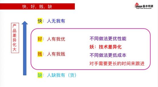 在产品上要形成差异化优势,总结起来四个字:快(人无我有)、好(人有我优,性能更优)、贱(人有我贱,成本更低)、缺(人缺我有货)。同时在技术上也要追求差异化,即“妖”,也就是通过不同的做法比别人的产品性能更好或者成本更低,这样对手需要花更多的时间才能赶上。