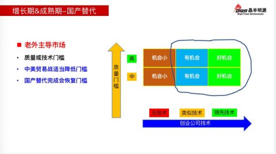 老乡PK:在国内客户主导的市场领域,属于老乡PK,关键的要素是技术水平和客户关系。拥有领先技术以及客户渠道是拥有机会的;拥有领先技术但无客户关系尚可期待破局;拥有类似技术以及有客户渠道机会相对小。在增长期&成熟期,打败“老乡”的机会较小。这已经是中国芯片公司做大的市场,在这个领域创业已无技术优势,也无运营优势。