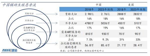 在《Reproductive Biology and Endocrinology》的统计中,超过 20%不孕夫妇需要人类辅助生殖技术(ART)。作为参考,剔除15-20%的代孕后,美国的辅助生殖渗透率为24-25.5%,而中国目前仅7%,还存在着较大提升空间。