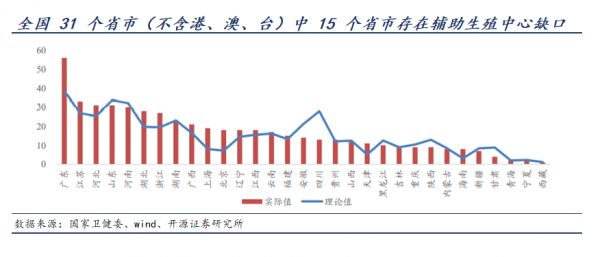 根据《人类辅助生殖技术配置规划指导原则》,每 300 万人应规划设立一家辅助生殖中心,然而现存数据显示,全国有15 个省市存在配置缺口。人口大省之一四川缺口最多,达到 15 家,安徽缺口 7 家,甘肃缺口 5 家。相反,一线城市和经济更发达的东部、南部地区存在超配的情况,其中,广东超配18 家,北京、上海超配 11 家。
