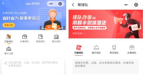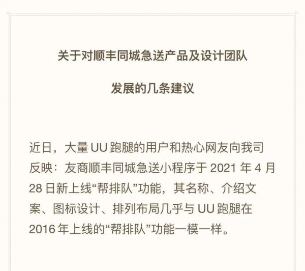 近日,UU跑腿官微发声喊话顺丰,在《关于对顺丰同城急送产品及设计团队发展的几条建议》一文称,顺丰同城急送小程序的帮排队功能,与UU跑腿在2016年上线的帮排队功能相同。