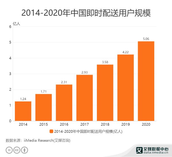 同城配送的出现满足了消费者省时省力、方便快捷的心理需求,随着新零售规模扩张,各品类商品更加齐全,用户规模在持续增长。艾媒数据显示,即时配送用户规模已从2014年的1.24亿人增长至2020年的5.06亿人,增长了近5倍;而月跑腿行业活跃用户量在去年年中达到了450万人。