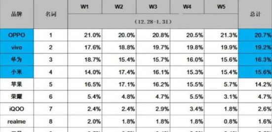 据第三方数据公布的今年一月份手机销量数据显示,vivo的销量占比达到了19.2%,OPPO的销量占比高达20.7%。紧随其后的是华为小米。销量高低排名可能有变化,但国产手机品牌top4的江湖地位似乎已经趋于稳定,并且与第二三国产手机品牌的差距在拉大,甚至后面几位总和都挤不进前六。