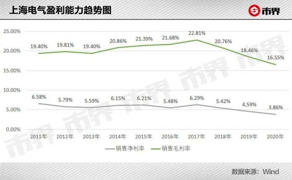 2011年-2017年,上海电气的毛利率处于小幅增长的状态,从19.4%上升至22.81%,但2018年开始有所下滑。
