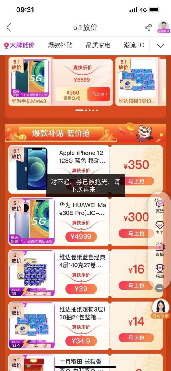 “真快乐”APP的五一价格战主打商品优惠券早早被抢光