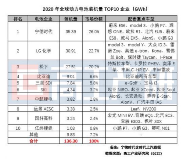 通过2020年全球动力电池装机量TOP10排行就能够看得出来,宁德时代、LG化学以及松下这三家动力电池供应商分别以35.39GWh、30.91GWh、27.51GWh的装机量占据了全球68.9%的动力电池市场份额。