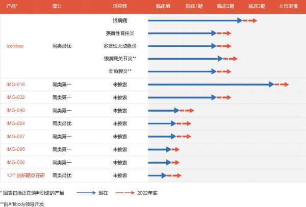 「创响生物」目前有近20个在研产品,其最成熟的产品Izokibep(IMG-020)是一种新型的双特异性融合蛋白,可有效靶向IL-17A和白蛋白。该产品是由Affibody的专利蛋白质治疗平台(Affibody®技术)和Albumod™技术相结合研发的小分子药物,对IL-17A有很高的表观亲和力,同时具有便捷、使用频率低和可在家中进行皮下注射的优点,目前即将在美国、中国和欧洲针对多个适应症进入II期或III期临床试验。
