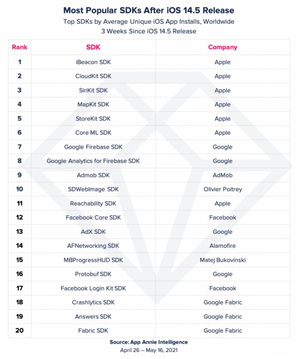 iOS 14.5 发行三周内全球最受欢迎 SDK