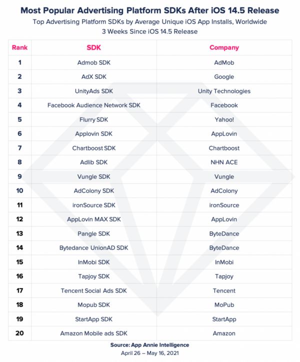 iOS 14.5 发行三周内全球最受欢迎广告平台 SDK