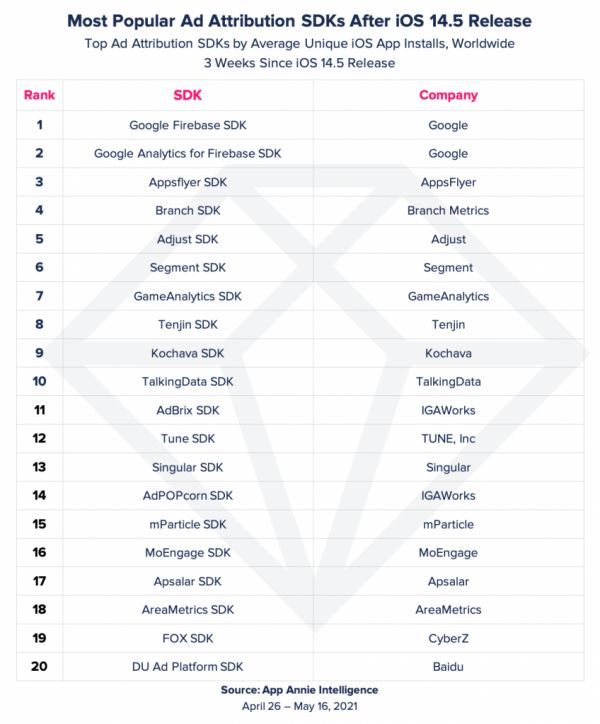 iOS 14.5 发行三周内全球最受欢迎广告归因 SDK