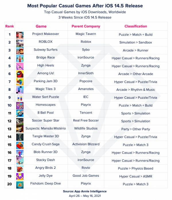 iOS 14.5 发行三周内全球最受欢迎休闲类游戏