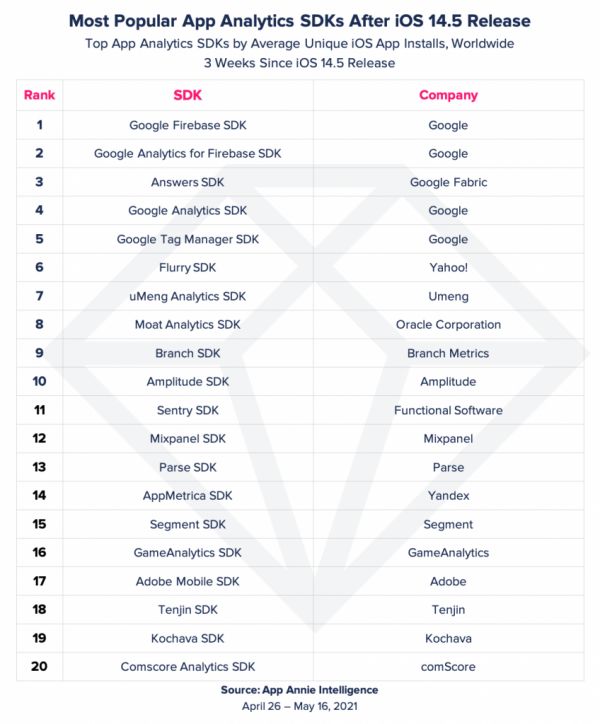 iOS 14.5 发行三周内全球最受欢迎应用分析 SDK