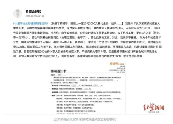 临近毕业,社交媒体上传出猿辅导、高途课堂等在线教育机构毁约应届生的消息。