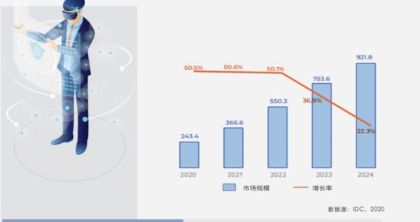 IDC在《VR产业研究白皮书》中预测,由于更低的技术门槛与更精准的应用场景,商用VR市场将在未来几年持续增长。到2024年,中国商用VR市场规模将达921.8亿,约为2020年的3.8倍。