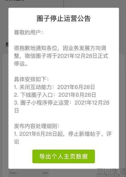 与其他“关门大吉”的软件/功能一样,微信圈子的关闭同样也是分阶段执行。6月28日,微信圈子的互动功能与入口将被关闭,用户将不能发布新的内容,而在这一时间点之后,用户可以使用 " 导出个人主页数据 " 的功能,来保存曾在其中发布过的内容。